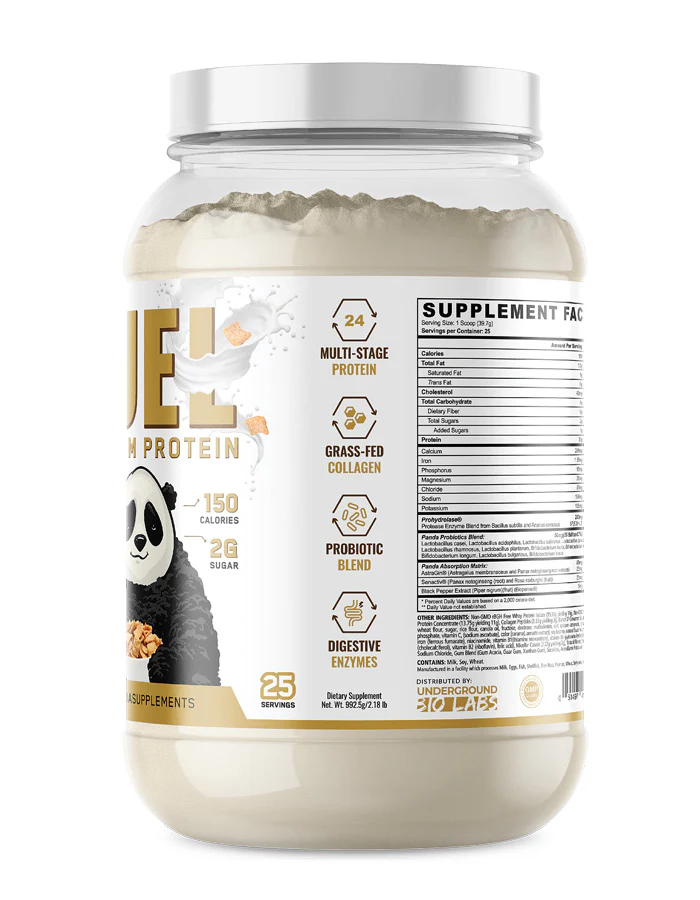 PANDA SUPPS FUEL is the finest Multi-Phase, Premium Protein to ever hit the market, using premium ingredients such as Non-GMO Whey Protein Isolate, Grass-Fed Hydrolyzed Collagen, Whey Concentrate, Casein Protein, Pro-Biotics and Digestive Enzymes to help promote healthy digestion. With a plethora of trademarked  ingredients backed by studies and clinical research, Panda will keep you safe from false claims and empty promises. So get ready to be FUELed for hours with this deliciously scrumptious powder containing 30 grams of protein per scoop, only 4 grams of carbs and 2 grams of sugar.